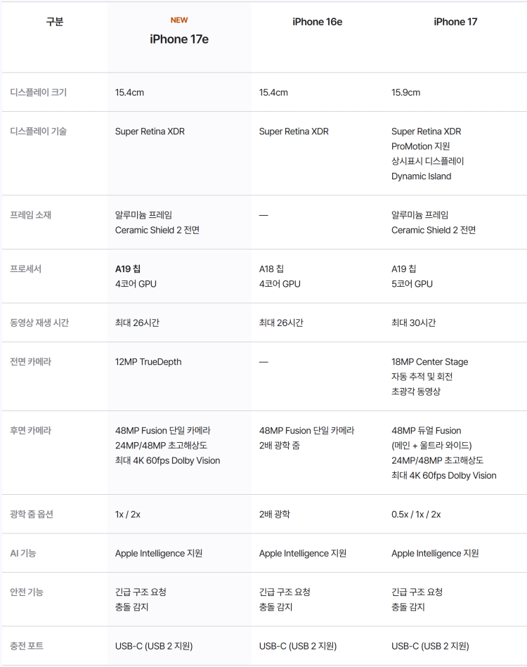 디스플레이, 카메라 같은 부분에서 아이폰17보다 17e가 더 열세합니다.